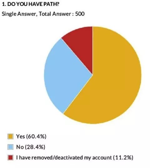 Pertanyaan pertama dalam survey ini adalah apakah responden memiliki akun Path atau tidak. Sebagaimana yang kita dapatkan dari hasil survei, 60,4% responden menyatakan bahwa mereka memiliki akun Path dan masih aktif, sedangkan sisanya (28,4%) tidak memiliki akun Path. Dari hasil ini, kita dapat mengetahui bahwa setidaknya 11,2% responden adalah mereka yang memutuskan untuk menghilangkan atau menonaktifkan akun Path mereka.